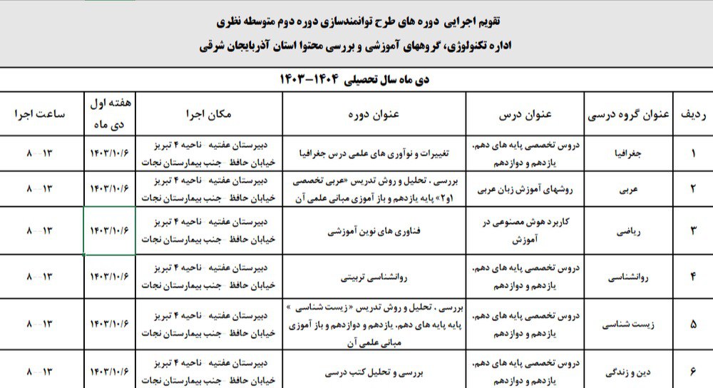 کارگاههای تخصصی و دوره های طرح توانمندسازی گروههای درسیتقویم اجرایی کارگاههای تخصصی و دوره های طرح توانمندسازی گروههای درسی دوره دوم متوسطه نظری